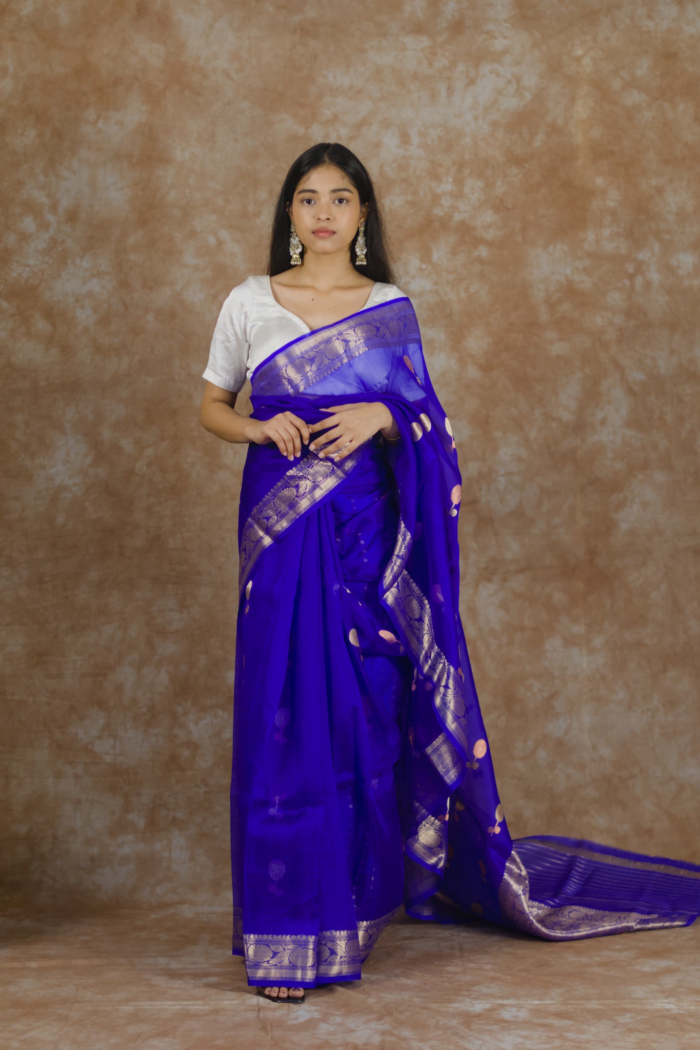 Draped in regal grace, this royal blue pure handloom Kora silk saree is a testament to Banarasi artistry. Woven in sonarupa kadhwa, radiant marigold motifs bloom across the body in silver and copper zari, brought to life with intricate meenakari detailing.